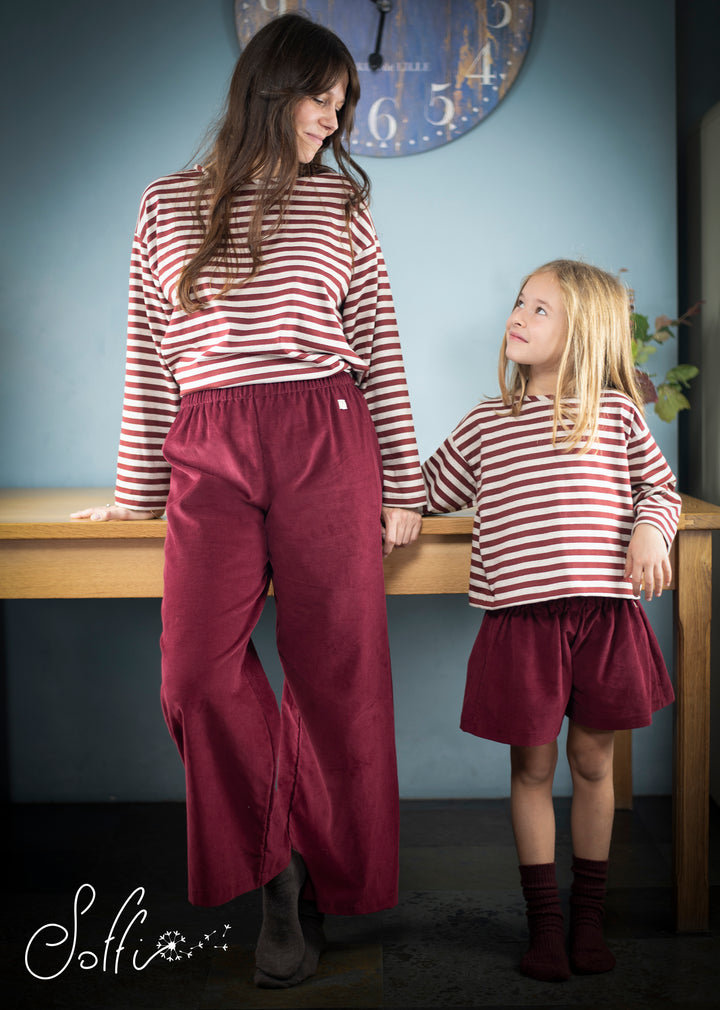 T-shirt manica lunga in jersey di cotone elasticizzato a righe colore beige-amaranto.