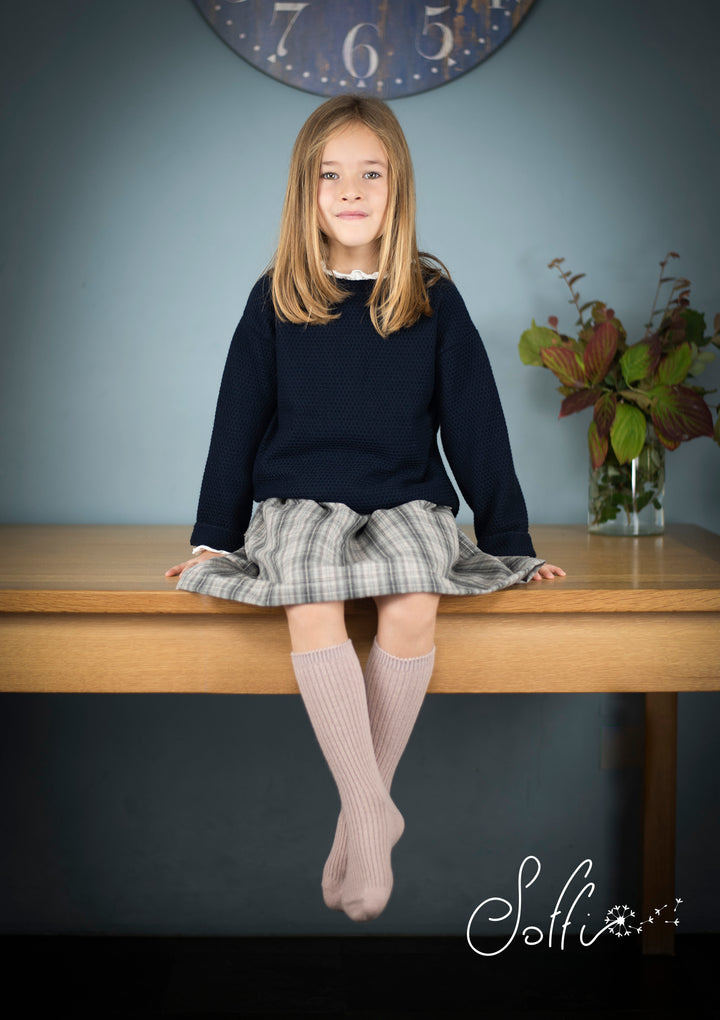 Gonna in flanella di cotone scozzese nei toni del grigio-cipria.