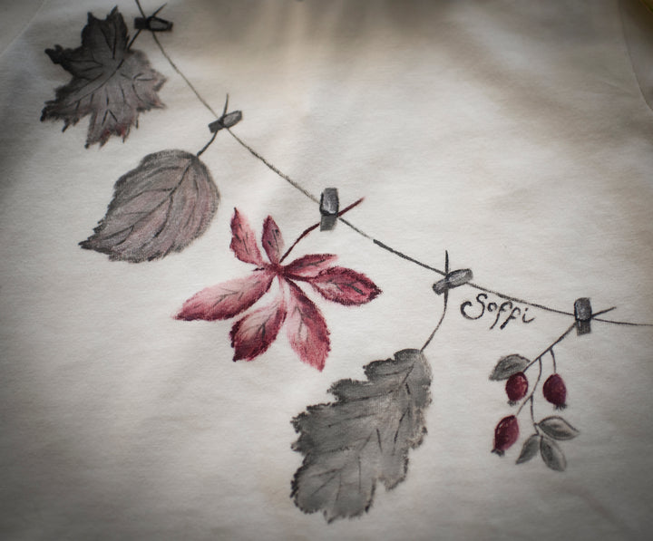 Motivo "foglie d'autunno" dipinto a mano colore grigio-burgundy.