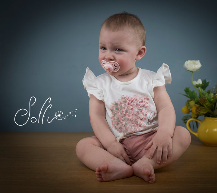Motivo "fiori e farfalla" dipinto a mano colore rosa-verde.